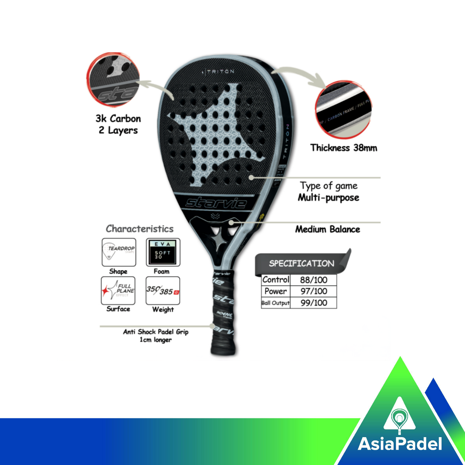 StarVie Triton Soft raket padel dengan inti EVA Soft 30 yang memberikan feel lembut, kontrol stabil, dan power nyaman di setiap pukulan. Struktur carbon dengan Face 3K Carbon dan permukaan kasar Full Plane Effect meningkatkan spin dan presisi. Dilengkapi Longer Handgrip dan sistem anti-vibration Noene Inside, raket ini ideal untuk pemain intermediate–advanced yang ingin kombinasi power, kontrol, dan kenyamanan maksimal.
